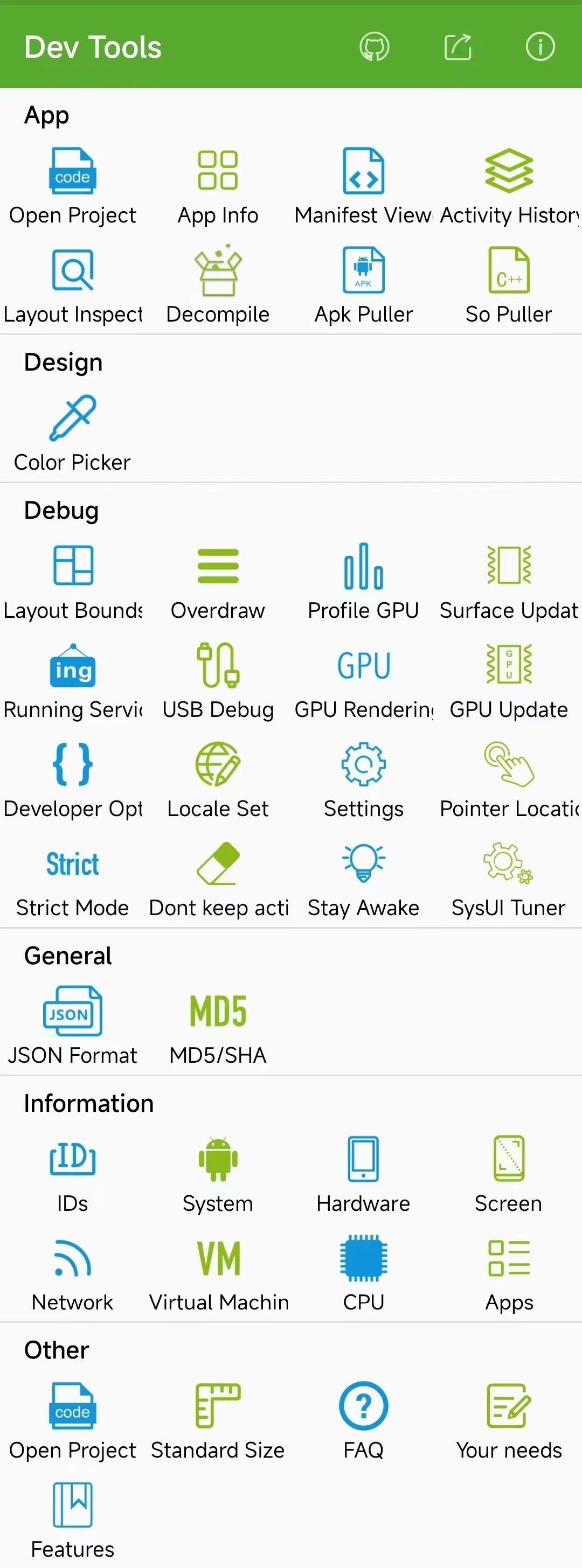(1) App Related: Quickly learn from other app. For example, view the view's ID of other apps, decompile, view manifest, the latest open source projects. Include Open Project, App Info, Manifest View, Activity History, Layout Inspect, Decompile, Apk Puller, So Puller.